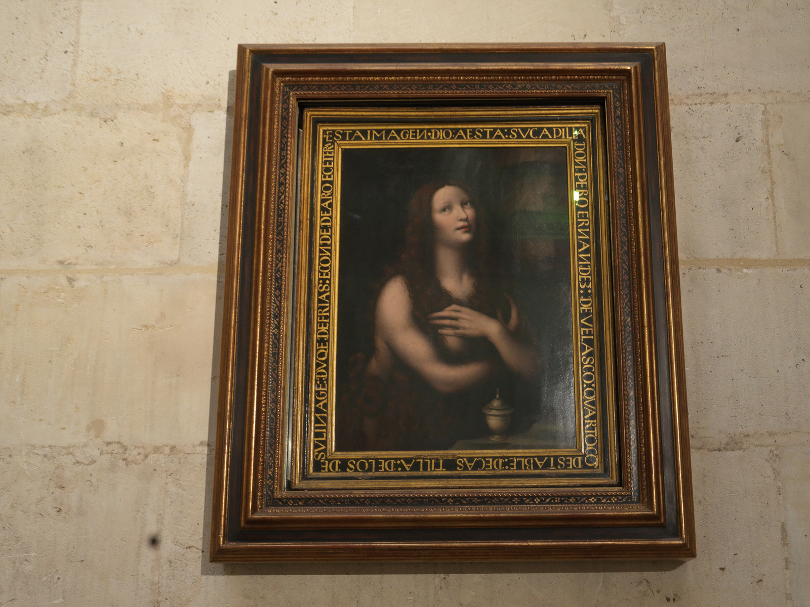 Irgendwo mittendrin hängt ein Bild, das uns an ein anderes Kunstwerk erinnert. Wir lesen nach: Es ist die „Santa Maria Magdalena“ von Leonardo da Vinci und Giovan Pietro Rizzoli.