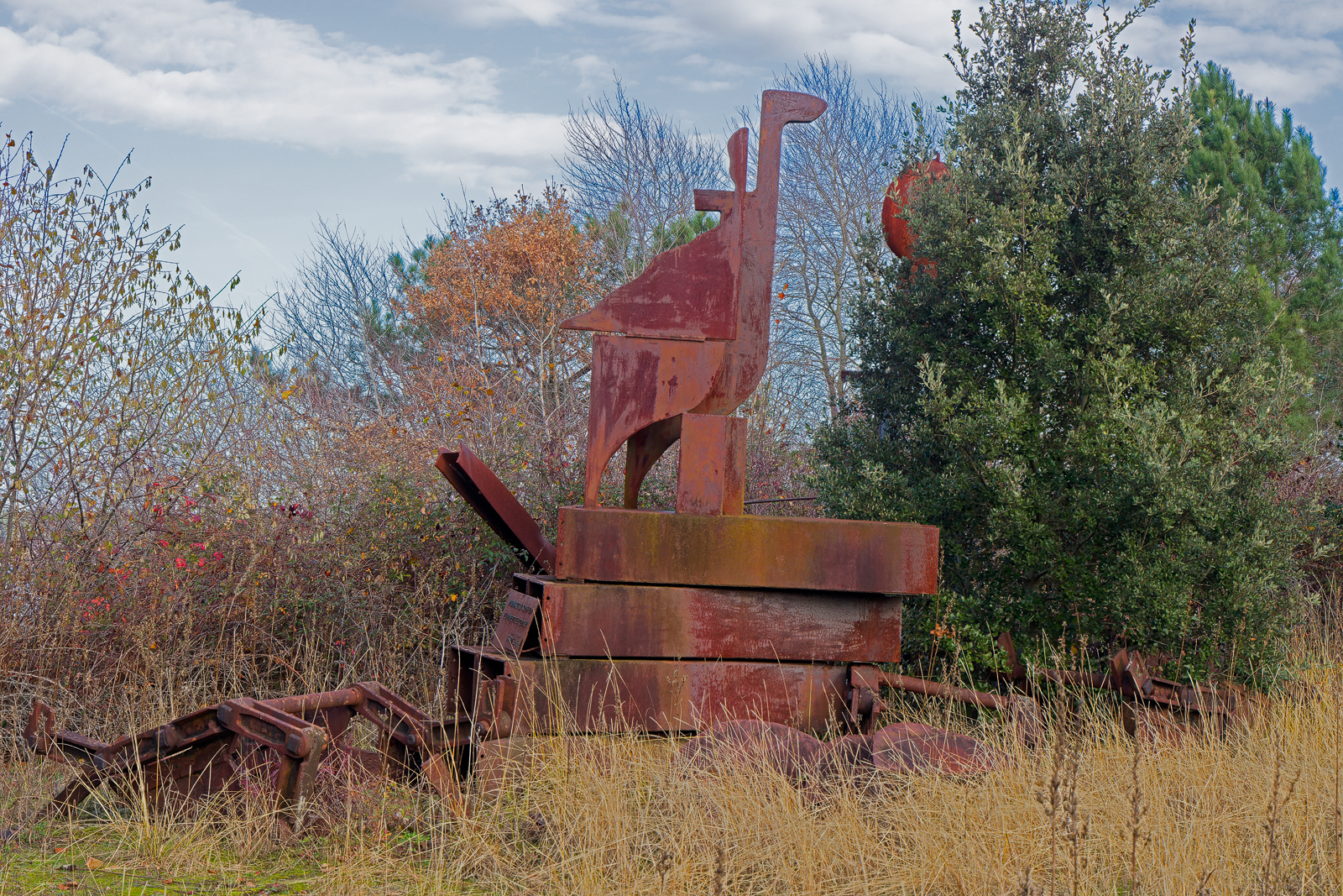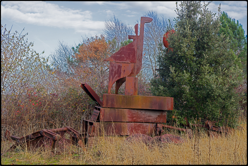 Anders als die Zugvögel wollen wir hier nicht überwintern, sondern weiter auf die Kanaren ziehen. Die Pause und die Wanderung nach 1700 Kilometern Fahrt tun gut. Wir umrunden den See in der Hoffnung hier heimischen Wildschweinen zu begegnen, finden aber nur ihre Spuren. Auch Kraniche lassen sich nicht blicken. Abgesehen von einem aus Stahl.