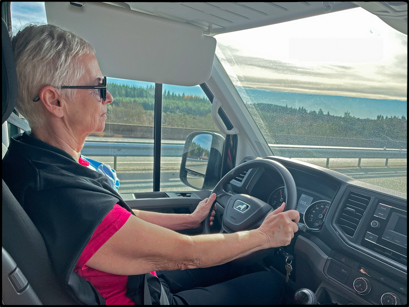 Etliche Besucher von Oloron-Sainte-Marie kommen zu Fuß, denn das hübsche Städtchen liegt am Jakobsweg. Wir reisen natürlich mit unserer woMAN an. Zum ersten Mal bin ich auf einer engen Straße mit überhängenden Felswänden am Steuer. Das Foto stammt allerdings von einer Fahrt davor. Auf dem Weg über die Pyrenäen war Bruno damit beschäftigt, mir die Abstände zum Fels anzusagen.